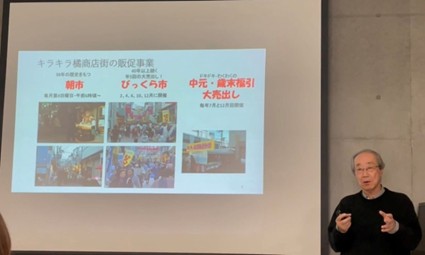 午前中の講義では、向島橘銀座商店街協同組合(商店街の愛称は1985年に公募により「キラキラ橘商店街」と命名)の事務局長である大和和道講師より商店街支援についてご講義いただきました。