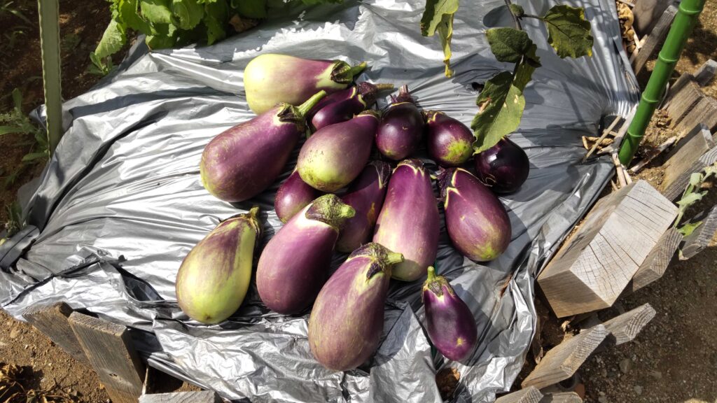 なす、ピーマン、しその収穫を行いました。猛暑日が続いており、なすも夏バテなのか皮は白くなっておりました。