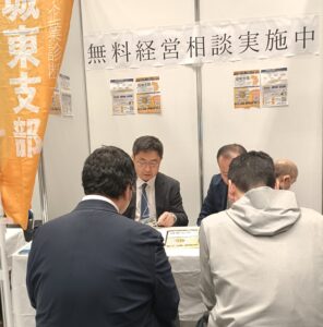 ブースでは、パンフレットを受け取った方々から「事業承継」「販路拡大」「売上向上」などに関する具体的な相談が寄せられました。皆様お時間が取れないとのことで、短時間での対応が中心となりましたが、的確な回答に対する感謝の言葉を頂くことができました。